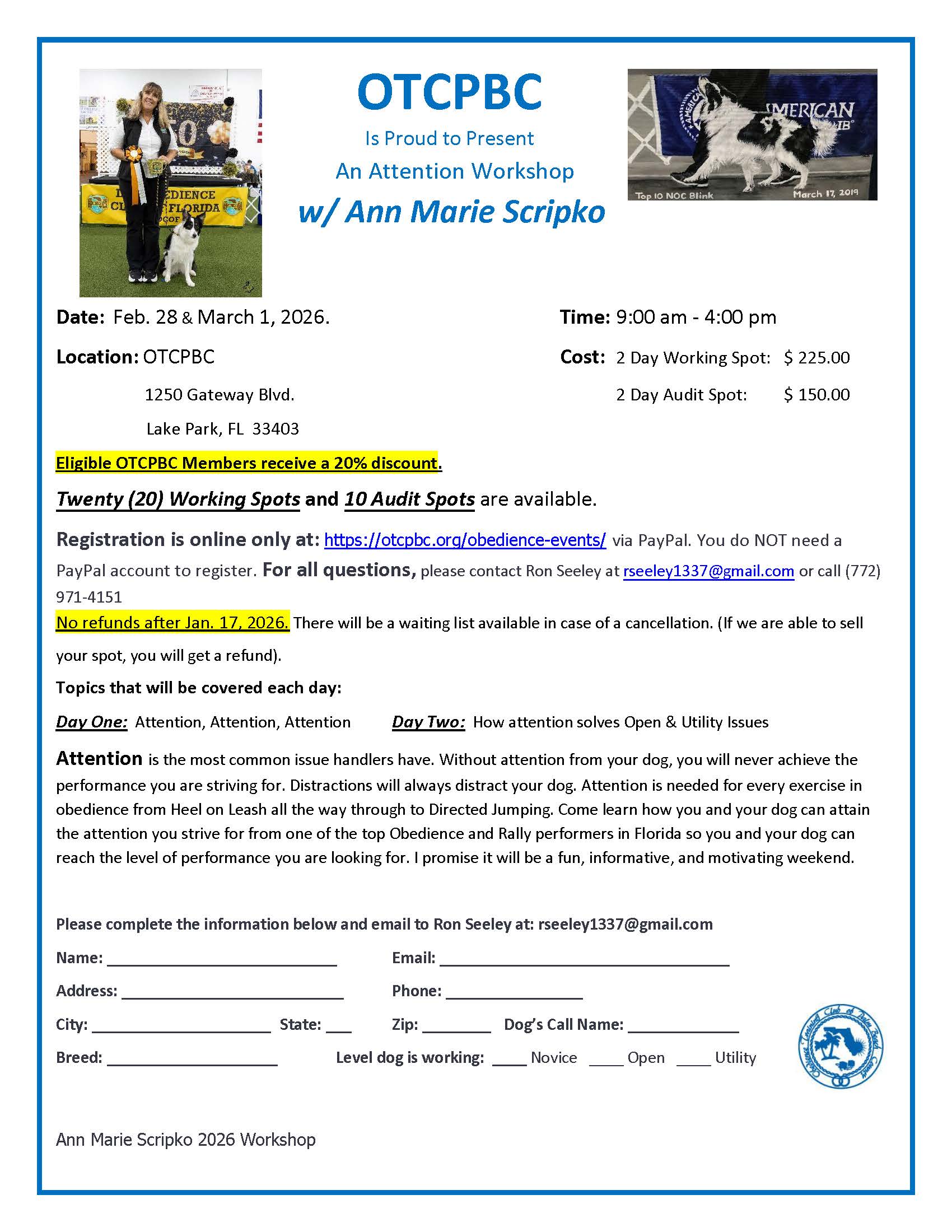 Registration is online only via PayPal. You do NOT need a PayPal account to register. Registration will remain open until spaces are full and a sufficient wait list is available. Wait listed registrations that do not obtain a space will be refunded. No refunds for cancellations after DATE unless the spot can be filled from the wait list. As of Date, the workshop is filled. If you would like to be on a wait list, please see flyer below for contact information.